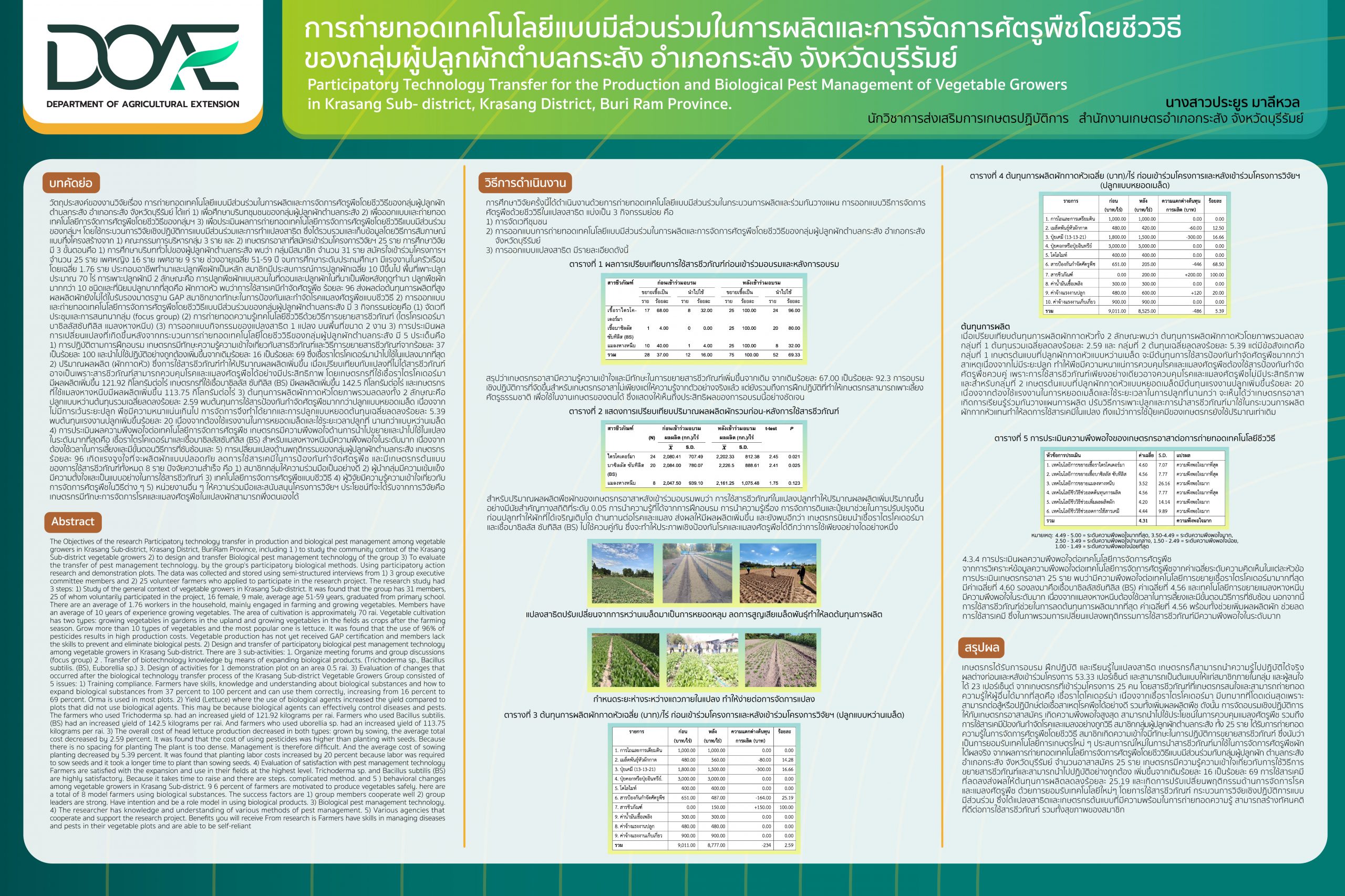 การถ่ายทอดเทคโนโลยีแบบมีส่วนร่วมในการผลิตและจัดการศัตรูพืชโดยชีววิธีของกลุ่มผู้ปลูกผักตำบลกระสัง อำเภอกระสัง จังหวัดบุรีรัมย์