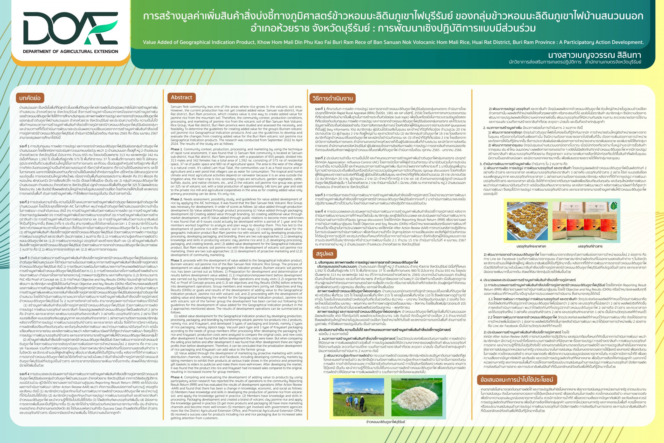 การสร้างมูลค่าเพิ่มสินค้าสิ่งบ่งชี้ทางภูมิศาสตร์ข้าวหอมมะลิดินภูเขาไฟบุรีรัมย์ ของกลุ่มข้าวหอมมะลิดินภูเขาไปบ้านสนวนนอก อำเภอห้วยราช จังหวัดบุรีรัมย์ : การพัฒนาเชิงปฏิบัติการแบบมีส่วนร่วม